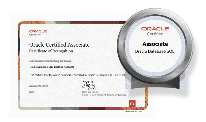 Um Oracle Database SQL Certified Associate comprova domínio dos conceitos fundamentais de SQL, incluindo queries, insert, update, delete, Data Definition Language, Data Control Language, optimizer, tables, indexes, data modeling e normalization, aplicados ao trabalho com o Oracle Database server em projetos de banco de dados.